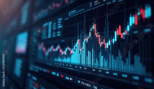 Stock market trading chart with glowing candlestick patterns, depicting financial analysis, investment growth, and economic performance in a digital environment.
