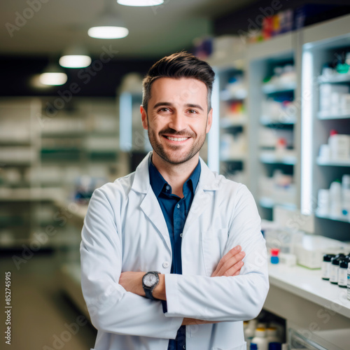 Stock minimalist photography of a smiling pharmacist standing at the pharmacy counter, surrounded by shelves of medications, bright lighting