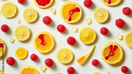 "Stock photo of a colorful mix of fresh fruits arranged over a white background. The assortment includes a variety of vibrant fruits, perfect for promoting healthy eating, fruit salads, or nutrition