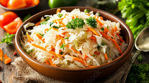 "Stock photo of homemade sauerkraut, showcasing its vibrant texture and natural fermentation process. Perfect for food-related content, health, or traditional cooking themes."