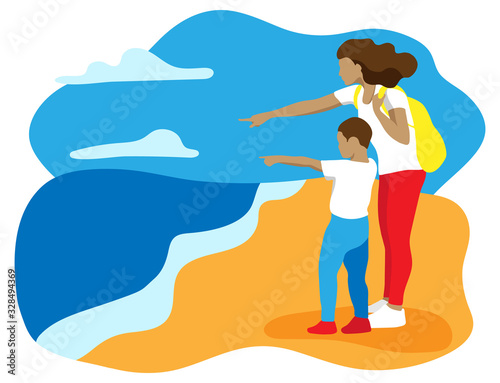Stock vector mom with little son on the sea shore pointing forward against sea and sky. Flat design