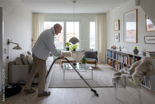 Stockholm, Sweden A man is vacuuming the living room in a modern apartment.