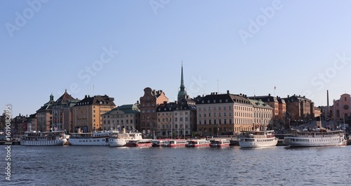 Stockholm's Glam Stam (old City) harbour at sunset with moored ships