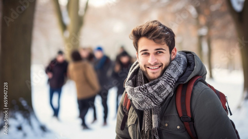 stockphoto, copy space, Cheerful male abroad student on campus with other students walking in background, winter scene. Young adult people, education, winter. Young male student on the campus. Outdoor