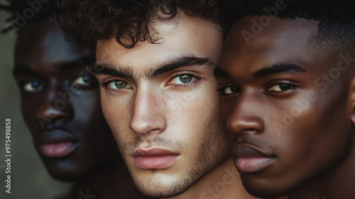stockphoto, multiracial male photomodels. Asian, caucasian, black or hispanic male models. Diversity theme. Ethnic different photo models posing for a studio photo shoot.