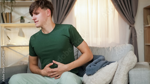 Stomach pain. Indigestion suffering. Unhappy man with abdomen problem feeling sick grasping belly in cramps sitting on sofa in home living room interior.