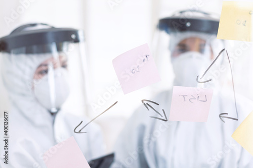 Stomatologs dressed in ppe suit during covid-19 as safety precaution. Medical team in stomatology office wearing coverall in dental office writing ideas on sticky notes.