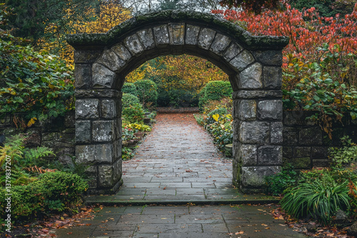 Stone archway leads to a tranquil garden path, autumn foliage surrounds.