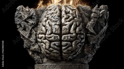 Stone Brain Enigma: A fiery sculpted brain in ancient vessel