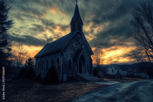 Stone church at dusk, dramatic sky