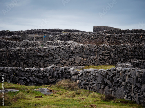 Stone fences of Aran Island, county Galway, Ireland. Fine example of hard work and long hours put in to finish the job. Popular tourist area with stunning nature scenery.