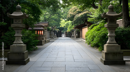 Stone Lanterns Frame A Cobblestone Path Leading Through Lush Green Trees And Traditional Wooden Buildings Under Daylight