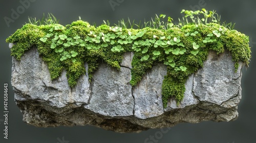 Stone platform with moss, grass, and small leafy plants