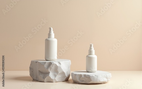 Stone podiums on a neutral beige gray studio background with two rock forms for showcasing cosmetic products creating an abstract minimalist scene with a trendy vibe and copy space image