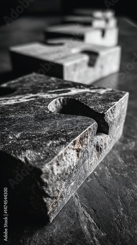 Stone puzzle pieces with interlocking notches on a dark surface, shallow depth of field