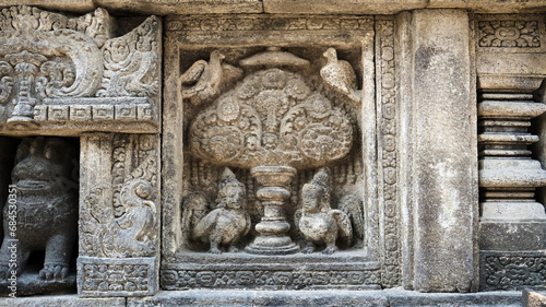 Stone relief on the wall of Prambanan Temple. A Hindu temple located in Yogyakarta, Indonesia