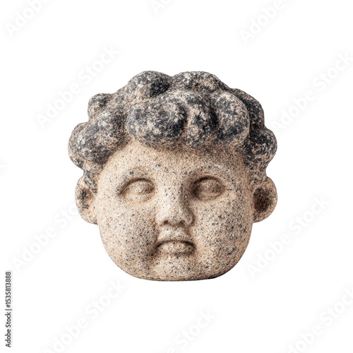 Stone sculpture of cherubic child head with curly hair and serene expression, showcasing intricate details and weathered texture