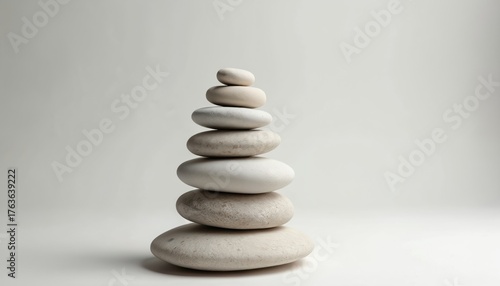 Stone tower stands. Balanced rocks in zen composition represent meditation harmony. Neutral background minimalist style highlights wellness spa. Concept of balance stability calm and peace.