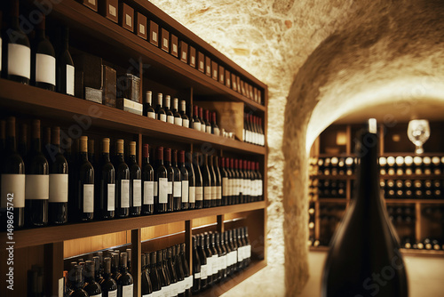 Stone Wine Cellar With Large Shelves of Bottles