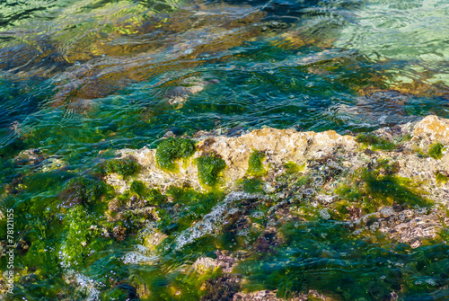 Stony beach with sea grass and flowing water.