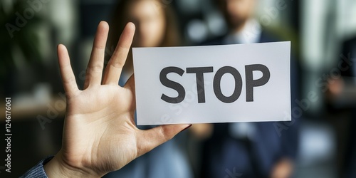 Stop Harassment Woman s Hand Holding STOP Sign, Blurred Figures, Office Background