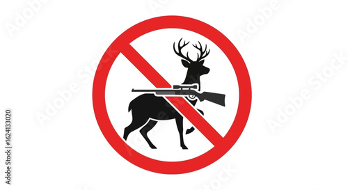 Stop hunting wildlife symbol. A red prohibition sign over a stag silhouette armed with a rifle for self-defense.