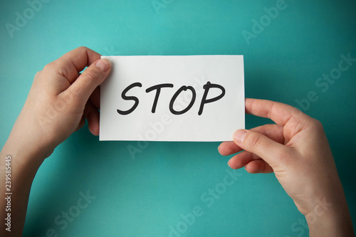 Stop inscription. Woman holding paper with STOP lettering in hands isolated on blue background.