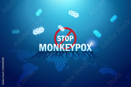 Stop Monkeypox virus pandemic sign on world map. New orthopox virus outbreak worldwide spreading. For awareness in human diseases infection. Medical and health care concept.