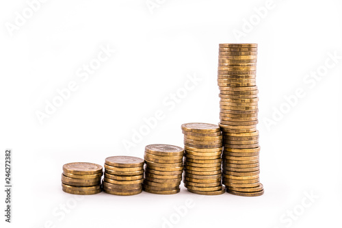 Stop motion rising stack of gold coins, rising money investment and increasing profits on a white isolated background. Concept: investment and profit growth