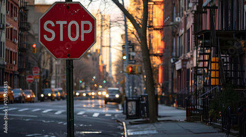 Stop sign on a city street at dusk with buildings and trees in the background.