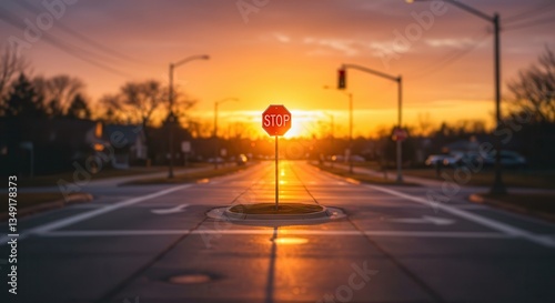 Stop Sign on Road at Golden Hour Sunset in Suburban Neighborhood