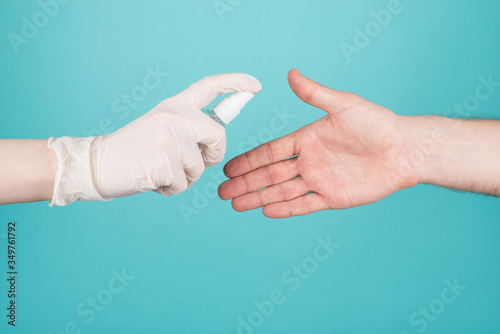 Stop spreading coronavirus patient concept. Cropped close-up photo of woman in gloves sprays sanitizer on man's hand isolated on blue teal turquoise background