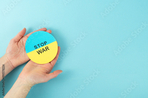 STOP WAR. Cardboard circle with Ukrainian flag and Stop war message in the hands of a woman on blue background. Copy space.