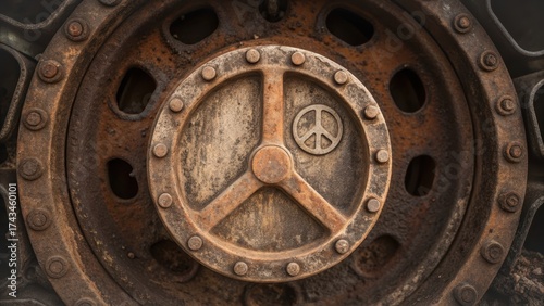 stop war illustration Rusty industrial valve with a peace symbol, showcasing texture and age.