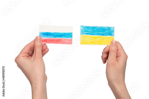 Stop war. Ukraine flag, Russia flag in woman hands isolated.