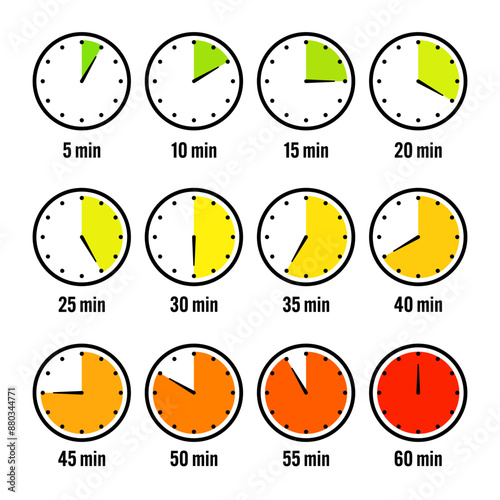 Stopwatch icons. Colorful simple chronometer, time counter with dial. Countdown timer showing hours and minutes. Deadline, measurement for sport. Cooking time label, sticker. Vector illustration