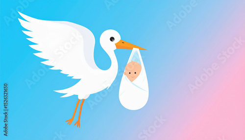 Stork delivering newborn baby boy wrapped in white blanket on blue and pink gradient background, newborn concept.
