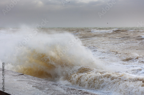 Storm at sea, storm warning on the coast. Thunderclouds and big sea waves during a storm. - image. Storm on the black sea in Crimea