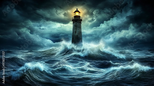 Stormy day at sea with high waves, dark clouds, lighthouse barely visible, dramatic stormy lighting