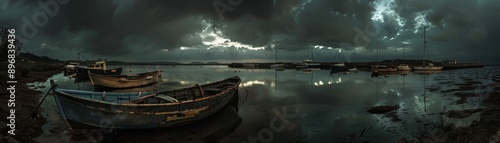 Stormy Night Drama at Small Harbor - Dark, Moody Seascape with Boats, Reflections, and High Resolution Quality