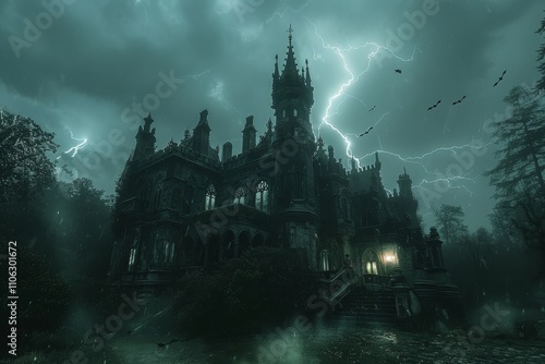 Stormy night with lightning illuminating a crumbling castle on hilltop with bats