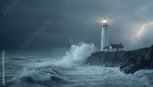 Stormy sea, lighthouse beacon