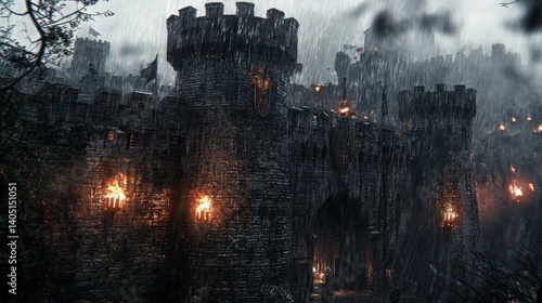 Stormy Siege: A Medieval Castle Under Siege in the Rain