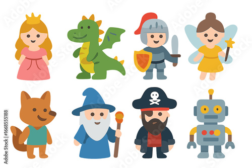 Storybook Characters Grid. Flat vector mini-illustrations story characters in colors children's illustrations: princess, dragon,