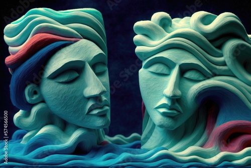 Storytelling expressive clay monolithic statues, easter island inspired - sculpted portraits conveying emotional conflict, thoughts shrouded in cloudy memories - generative AI.