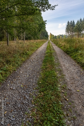 Straight path through summer forest under blue sky