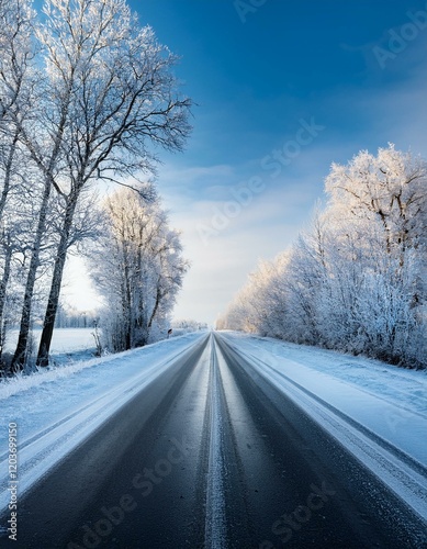 Straight road covered with snow and ice at winter
