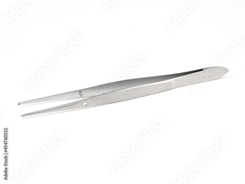 straight steel surgical tweezers with fang on a white background