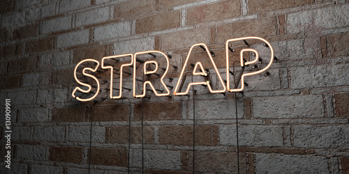 STRAP - Glowing Neon Sign on stonework wall - 3D rendered royalty free stock illustration. Can be used for online banner ads and direct mailers..