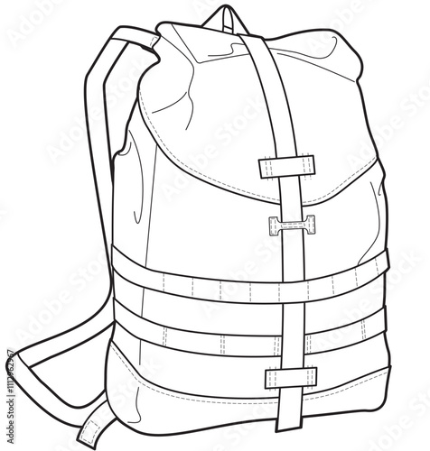 Strapped rucksack flat sketch vector illustration technical cad drawing template
